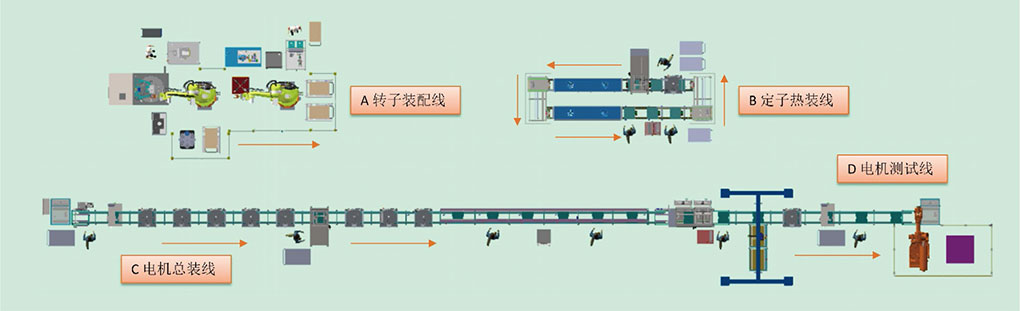 2、本線組成:轉子自動裝配線、定子自動熱裝線、電機合裝線、整機測試線。